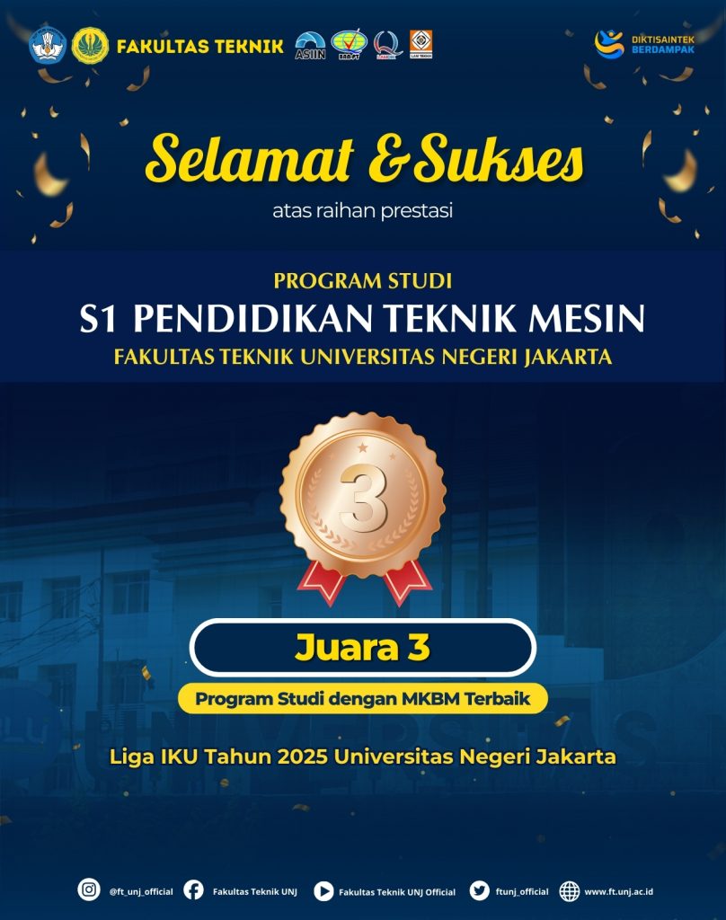 Kepada Program Studi S1 Pendidikan Teknik Mesin Fakultas Teknik Universitas Negeri Jakarta atas capaian Juara 3 Program Studi dengan MKBM Terbaik dalam Liga IKU Tahun 2025 Universitas Negeri Jakarta.